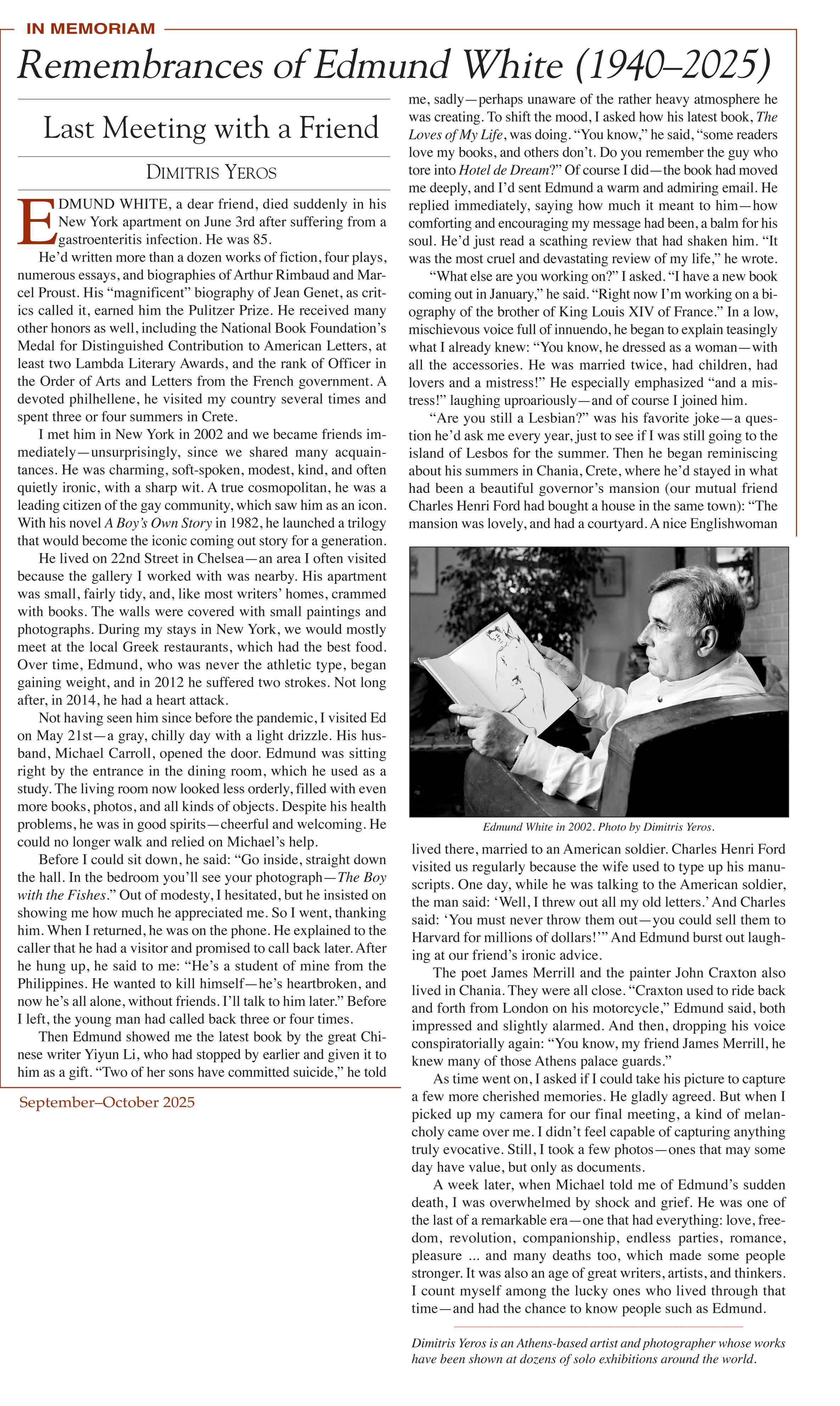 συνέντευξη στον Κωνσταντίνο Μπούρα Ο Δημήτρης Γέρος αποκαλύπτει στιγμιότυπα από το δικό του φωτογραφικό ταξίδι προς την καβαφική «Ιθάκη» με αφορμή την κυκλοφορία του υπέροχου λευκώματος Dimitris Yeros, Shades of Love – Photographs inspired by the poems of C. P. Cavafy. Πρώτα διαλέξατε τα ποιήματα και μετά τους «ήρωες» που θα τα ενσαρκώσουν ή μήπως κινηθήκατε αντίστροφα; Από τα μοντέλα δηλαδή προς τα ποιήματα; Πρώτα έβλεπα ποια ποιήματα μου έδιναν εικόνες που να μπορούν να γίνουν φωτογραφίες, αυτόνομες και ανεξάρτητες, ακόμα και για εκείνον που δε γνωρίζει τα συγκεκριμένα ποιήματα του Καβάφη, που να μη χρειάζονται δηλαδή την υποστήριξη των στίχων για να είναι κατανοητές και να υπάρξουν. Μετά αναζητούσα τα κατάλληλα μοντέλα. Πρέπει εδώ να σας πω –το λέω άλλωστε και στον επίλογο του βιβλίου μου– ότι φρόντιζα να επιλέγω «μοντέλα» που να έχουν κάποια σχέση είτε με τον ποιητή είτε με την ποίησή του. Δηλαδή επέλεξα ένα γνωστό γκέι ποιητή, τον Richard Howard, για να μπει στη θέση του Καβάφη, έναν πραγματικό γλύπτη, τον Arman, για να υποδυθεί τον Τυανέα, το γλύπτη του ποιήματος, τον Gabriel Garcia Marquez με την περιπετειώδη ζωή για την «Ιθάκη», τον Jeff Koons με τα χαζοχαρούμενα ποπ έργα για το «Σπίτι με κήπο» και ούτω καθεξής. Ακόμα και για το ποίημα «Στου καφενείου την είσοδο» επέλεξα να κάνω τη φωτογράφιση στο γνωστότερο γκέι καφέ της Νέας Υόρκης, το Factory, όπου νομίζω θα σύχναζε και ο Καβάφης, αν ζούσε σήμερα εκεί. Δεν ξέρω αν πρωτοτύπησα και πόσο επέτυχα, πάντως ήταν πολύ δύσκολη και κουραστική η όλη προσπάθεια. Επειδή ακριβώς δεν έβρισκα τα κατάλληλα μοντέλα, γι’ αυτό περιορίστηκα στα 67 ποιήματα που, ούτως ή άλλως, είναι πολλά για ένα φωτογραφικό βιβλίο. Τώρα, δώδεκα χρόνια μετά, κρατώντας στα χέρια σας αυτό το λεύκωμα νιώθετε σαν να φτάσατε στη δική σας φωτογραφική «Ιθάκη»; Δεν υπάρχει πραγματική «Ιθάκη». Υπάρχουν φανταστικές «Ιθάκες» και είναι οι στόχοι που βάζουμε ελπίζοντας πως αν τους επιτύχουμε, θα ικανοποιηθούμε. Σχετικά με το βιβλίο μου, ναι, καλώς ή κακώς πάντως έφτασα, και όπως για τον Καβάφη, έτσι και για μένα αυτό που αποδείχθηκε ενδιαφέρον δεν ήταν η άφιξη στην «Ιθάκη» αλλά το περιπετειώδες και καταπληκτικό ταξίδι. Θα ριχνόσασταν ξανά στην ίδια ή σε ανάλογη περιπέτεια; Ξαναρίχτηκα και ήδη έχει δρομολογηθεί να εκδοθεί ακόμα ένα φωτογραφικό βιβλίο μου, πάλι στην Αμερική. Πρόκειται για ένα ποιητικό κείμενο που είχε γράψει πριν από χρόνια ο Edward Albee για μια φωτογραφία μου και το οποίο εν συνεχεία με ενέπνευσε για να κάνω κι άλλες φωτογραφίες. Διαβάζετε σύγχρονη ποίηση; Φυσικά και διαβάζω ποίηση. Πολλοί από τους σημαντικότερους Έλληνες ποιητές και αρκετοί ξένοι είναι φίλοι μου. Πιστεύω ότι έχουμε εξαιρετικούς ποιητές, καλύτερους από πολλούς ξένους. Δυστυχώς όμως, απ’ τη μια η συνήθως ελληνοκεντρική θεματογραφία τους κι απ’ την άλλη η πολύ ωραία και πλούσια γλώσσα που έχουμε δε βοηθάνε για να μεταφραστούν ώστε να τους μάθουν και εκτός Ελλάδος. Αλλά νομίζω πως και οι ίδιοι οι ποιητές δεν προσπαθούν να ξεπεράσουν τα σύνορα. Κάποιοι από αυτούς έχουν βάλει στόχο τα πενιχρά και κατασκευασμένα κρατικά βραβεία και, επαναπαυόμενοι, προτιμούν τις συναθροίσεις σε μαγειρεία των Εξαρχείων αντί του διεθνούς στίβου. Απ’ την άλλη η ποίηση, διεθνώς, δεν πουλάει όπως συμβαίνει με την πεζογραφία και δεν έχει εμπορικό ενδιαφέρον για τους εκδότες. Φαντάζομαι να γνωρίζετε κι εσείς από πρώτο χέρι ότι οι εκδότε